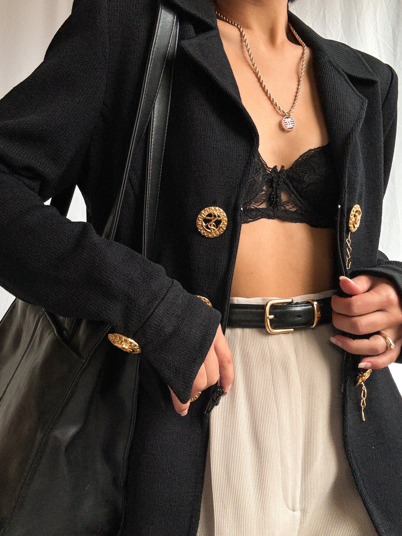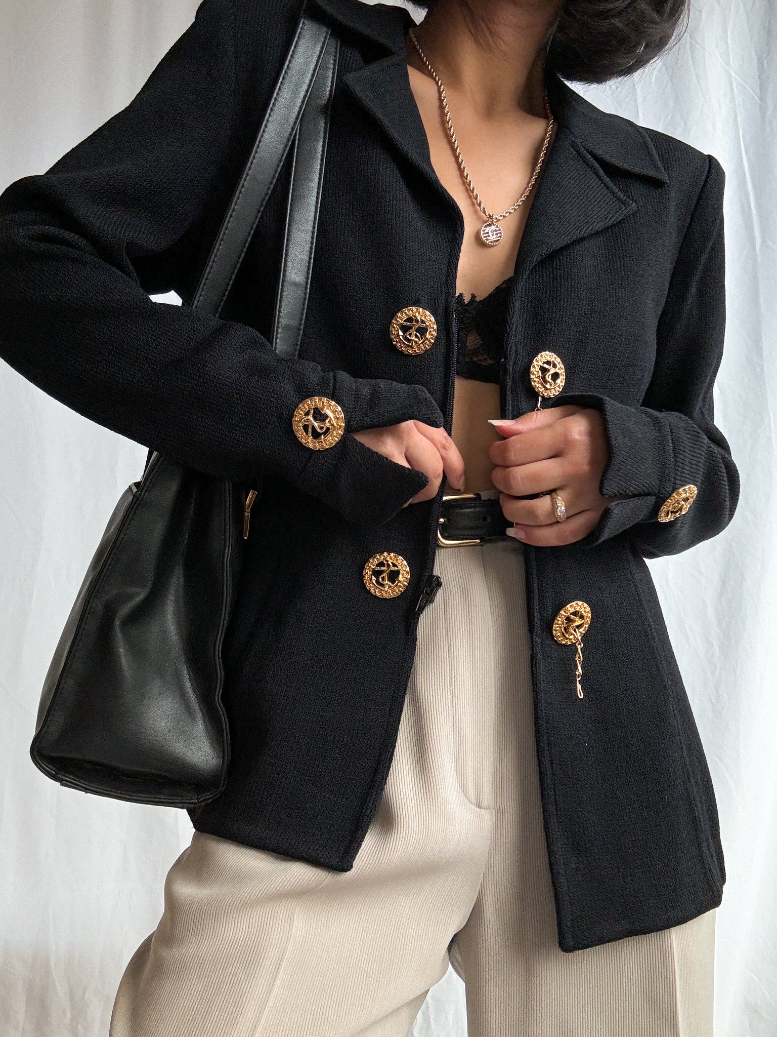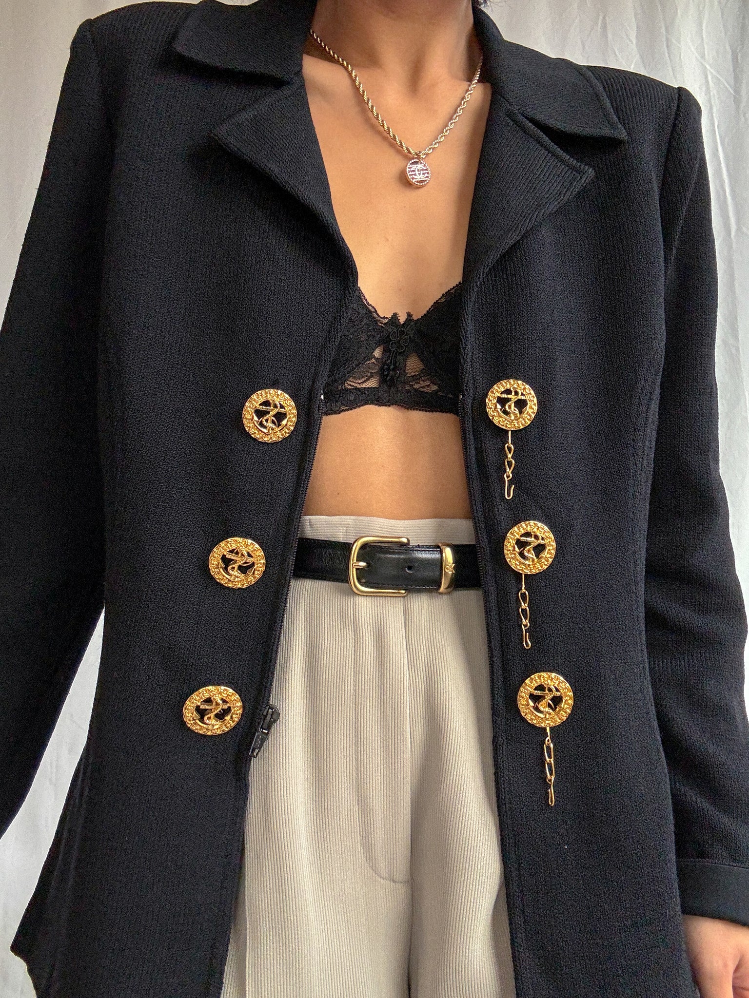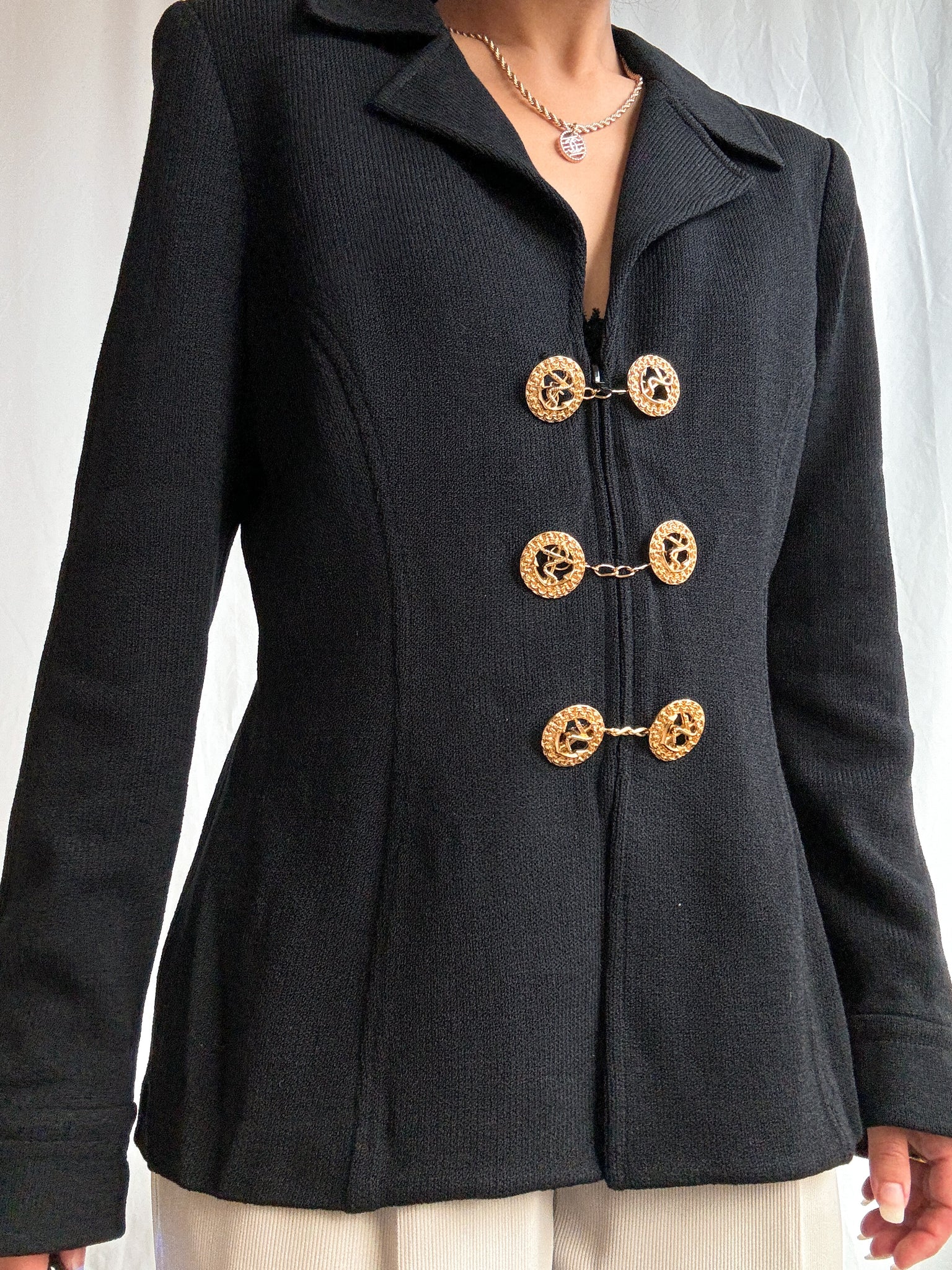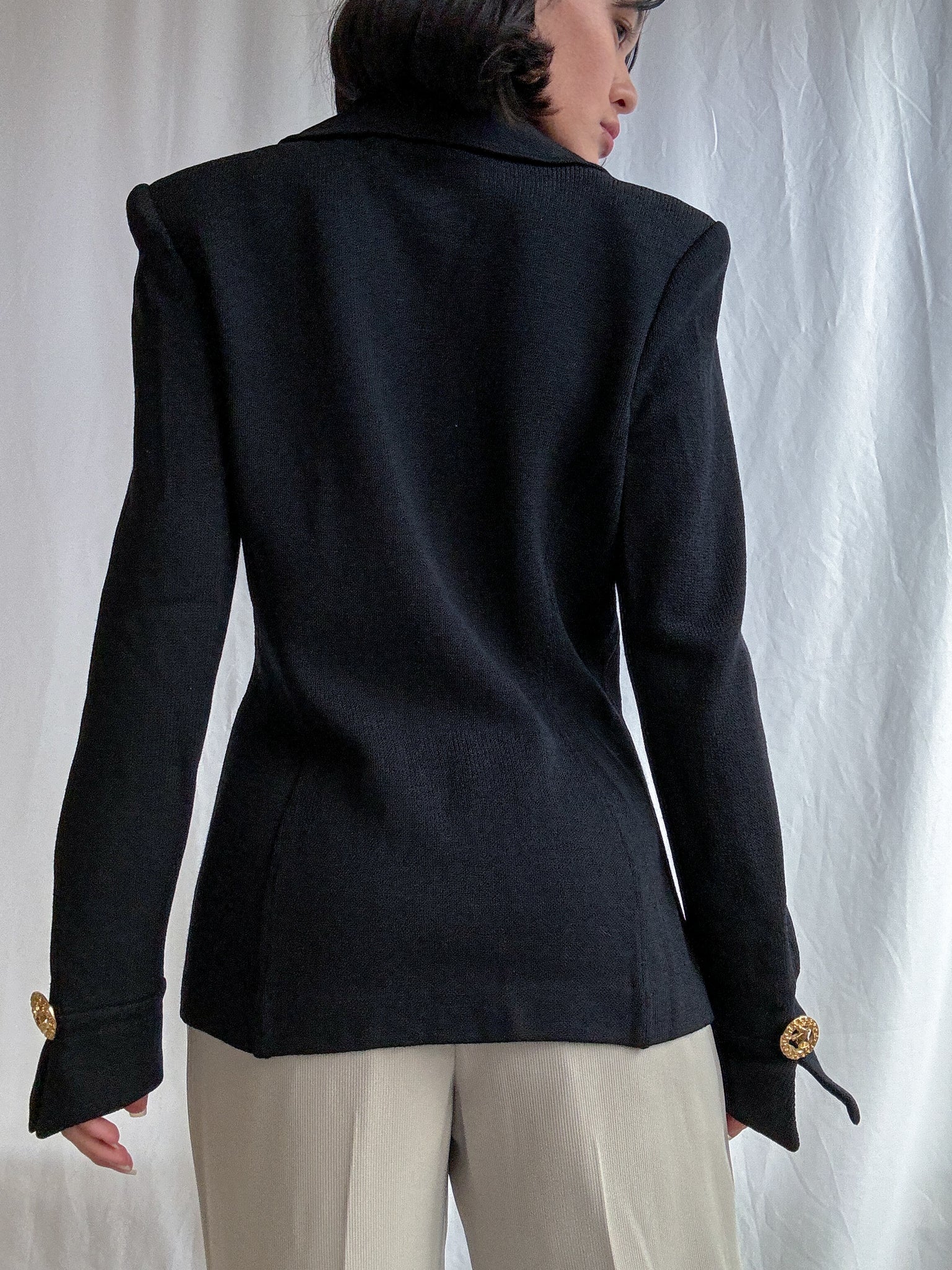A timeless 1980s vintage St. John by Marie Gray knit jacket in classic black. Designed with a nautical-inspired front, it features signature gold-tone metal buttons layered over a sleek zip-front closure. Crafted in St. John’s iconic knit, this jacket offers a refined structure with effortless wearability—an enduring piece that embodies vintage luxury and understated elegance.