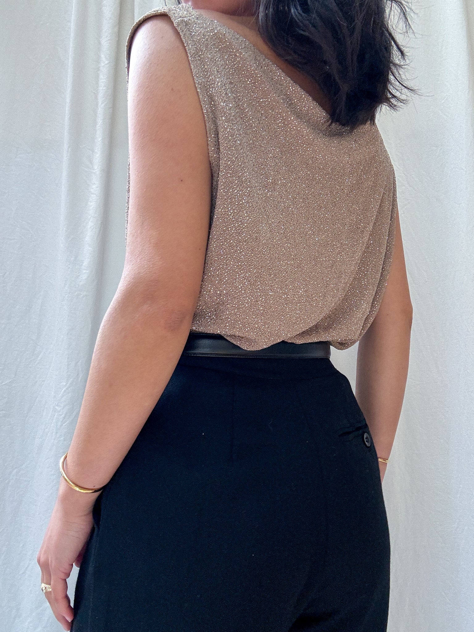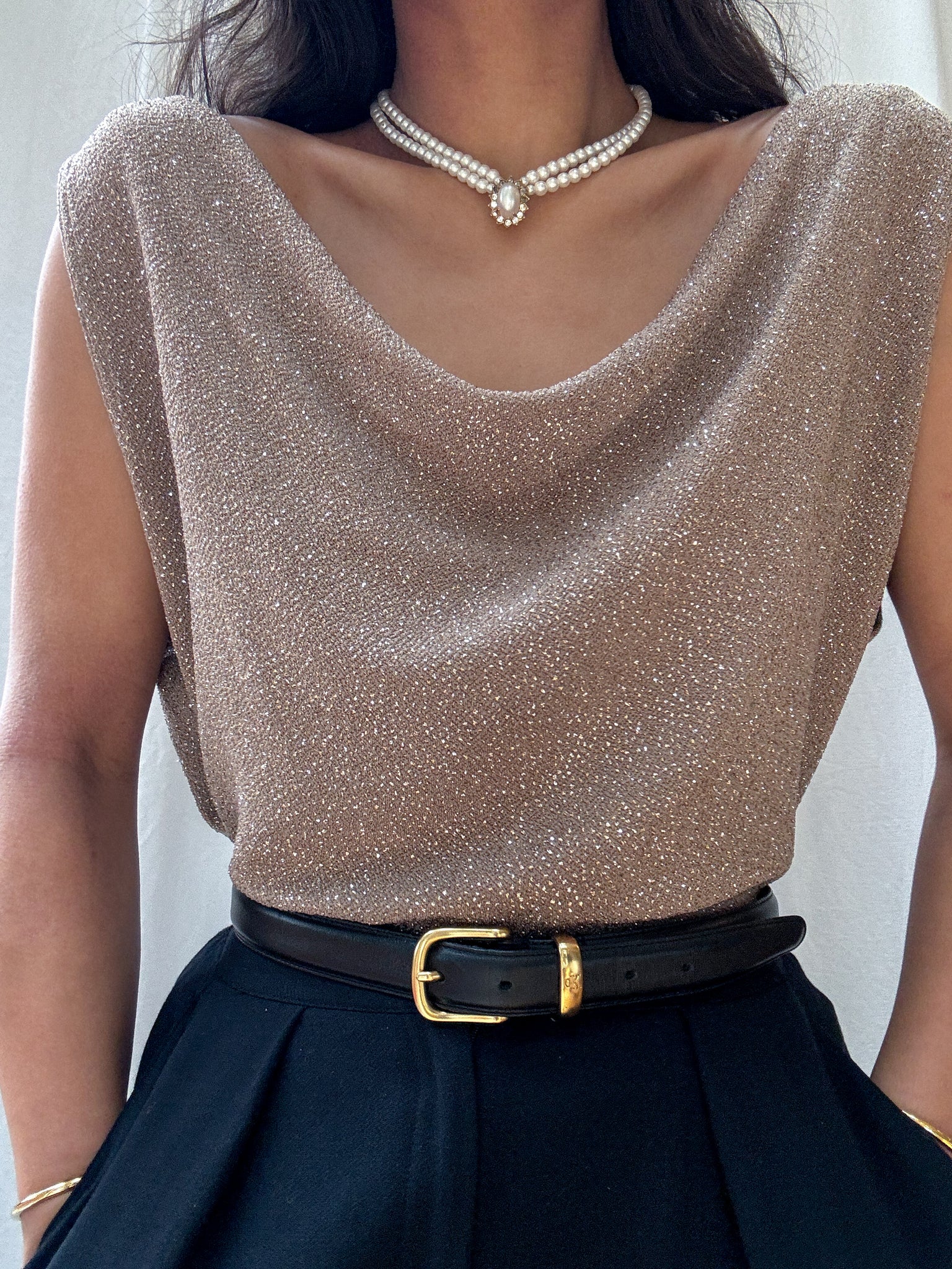 A 1990s vintage taupe sparkle tank top made in the USA, featuring a softly draped cowl neckline. Subtle glitter covered throughout the bodice that beams beautifully in the light. Crafted from a stretch fabric that skims the body comfortably, this piece adds subtle shimmer and effortless elegance to any look.